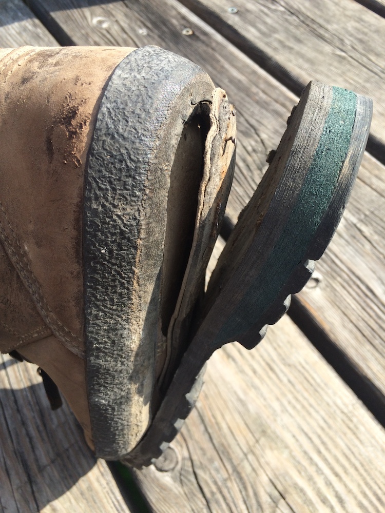 Fliegenpapier comes to my mind. With a growing sense of urgency, I scan the mountain face for alternative launch spots, and indeed a few hundred meters down, it looked like the rocks were not piling quite so high. And wasn't there a patch of grass even? Just then as I was pulling together my wing, the outer sole at the heel of one of my hiking boots came off, and my foot tore right through the inner sole. Functionally, the shoe had just turned itself into a flip-flop, with the perfect flapping sound to prove it.