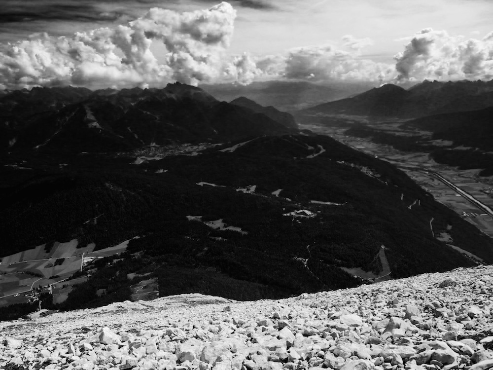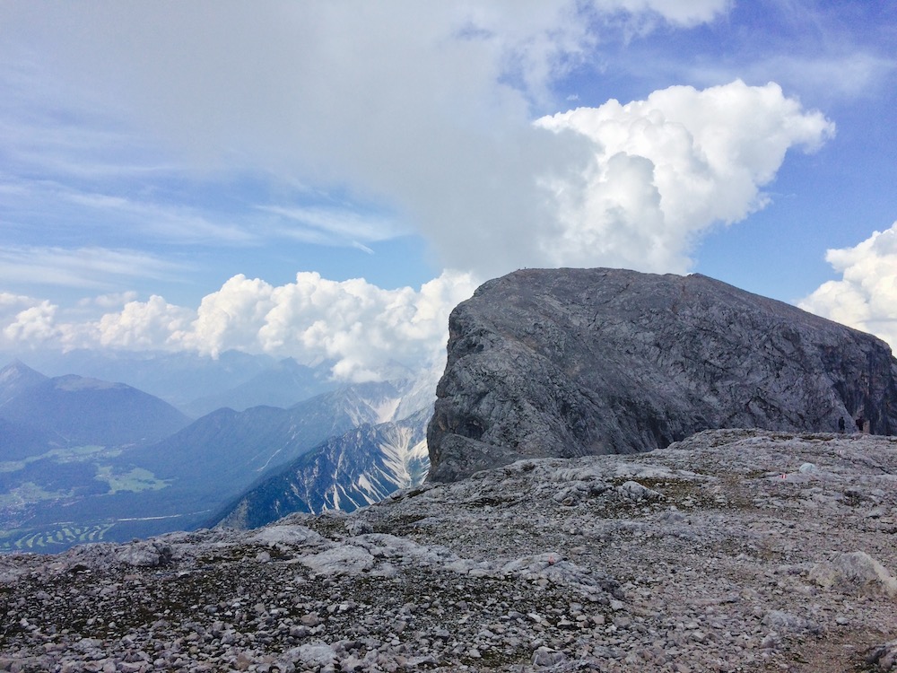 Eastern peak of the Hohe Munde at 2592m two and a half hours later, it slowly dawns on me that things may not be so easy after all. First off, I had run out of water. I had only brought half a liter, and made the mistake of not stocking up at the Rauth Hut. A longer flight was out of the question as was a continuation of the hike to the other peak at 2662m. Next, the ground below the peak was either prohibitively steep, or covered in rocks and rubble of all shapes and sizes, in which the lines of the glider would get caught up no matter what. And lastly, the clouds! Fluffy cumulus clouds they were at first, but they had by now grown substantially, especially upwards. It was entirely possible that within an hour or two they would mature into thunderstorms.