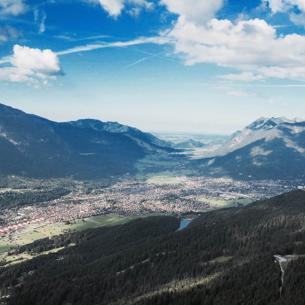 First flight in the Wetterstein mountains. View towards Garmisch-Partenkirchen.