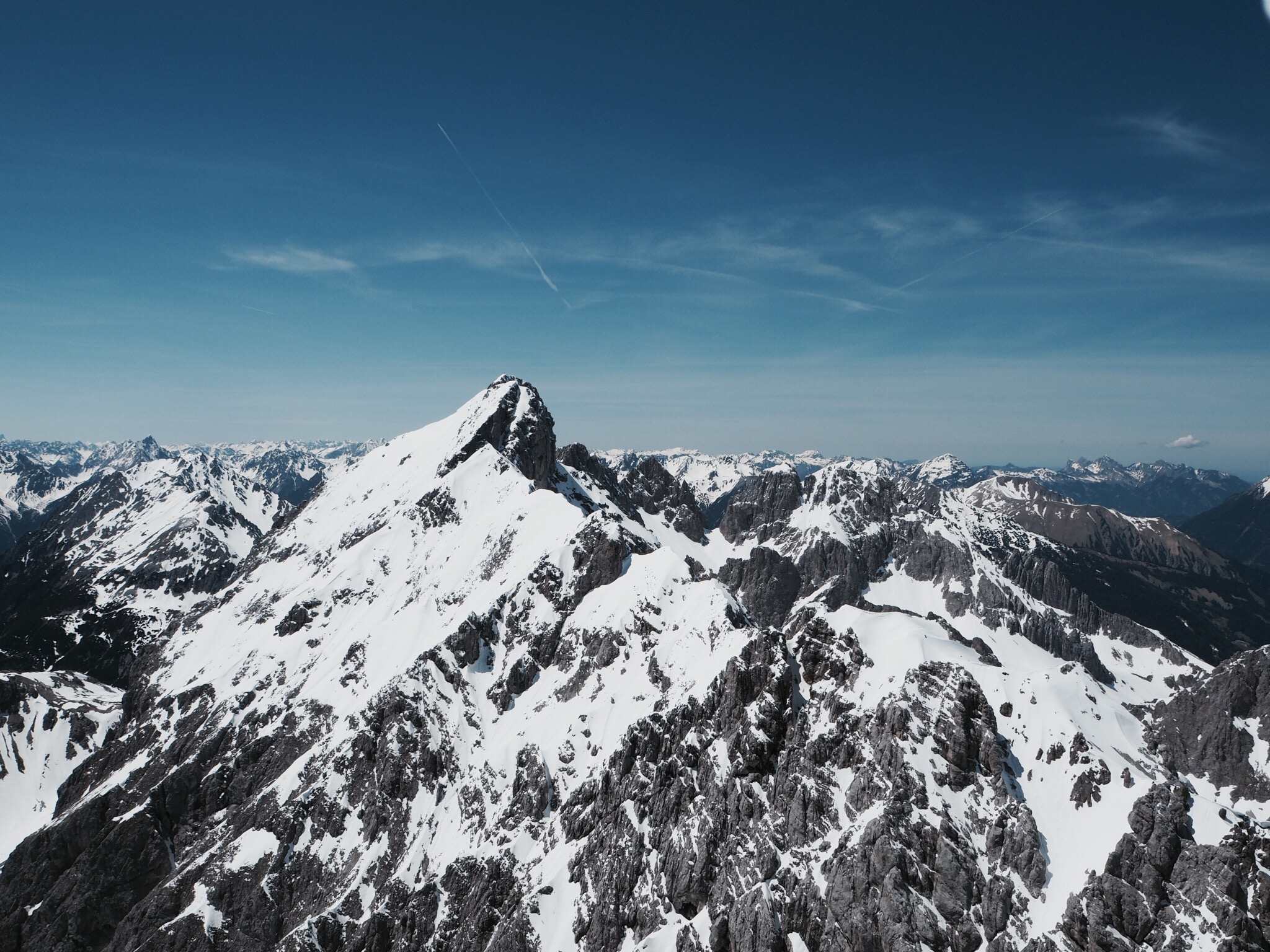 It takes a while until the valley wind from Innsbruck has enough strength to start balancing the strong West wind blowing at higher altitudes. After an hour or so of waiting, I finally launch my brand-new Epsilon 8 on a steep, boulder-strewn patch twenty meters below the summit into what's now become a gentle breeze. A few minutes later, and a few hundred meters higher, I begin to see the Zugspitze and then the main chain of the Alps in the distant South. It's undescribable. Up here the air is so calm that I can take lots of pictures with my new Olympus EM-10. At last, after not having had a portable camera for years, I can keep digital memories of my flights again.