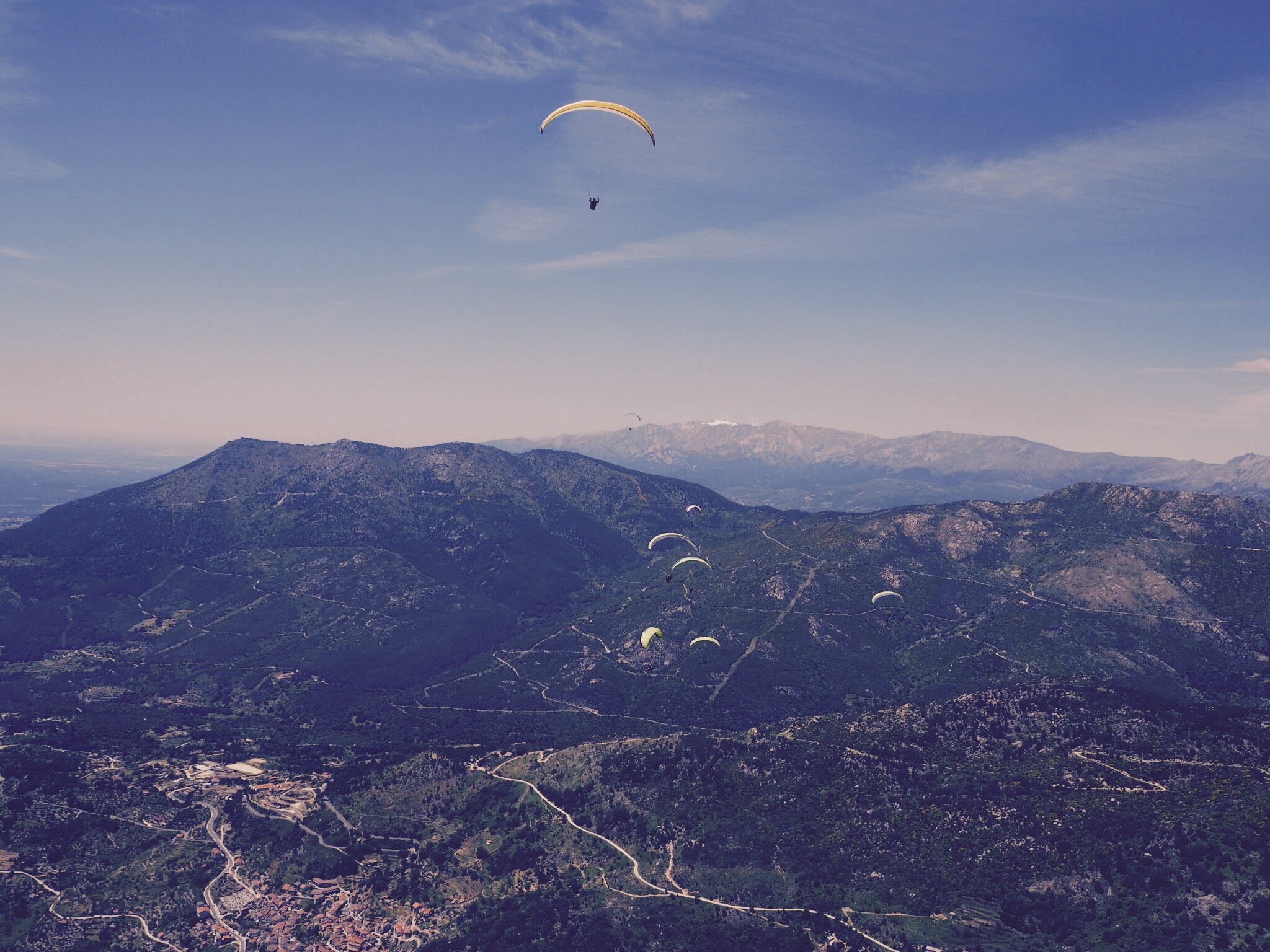 My new Epilson 8 flies beautifully and after two hours of messing about in broken thermals, gets me down safely at take-off. Top landing isn't without risks here as the wind gets strong and turbulent during the afternoon, and the site is littered with boulders and flanked by trees. But it saves you a hell of a ride, because the only other place anywhere close to Pedro Bernardo is the official landing site all the way in the valley.